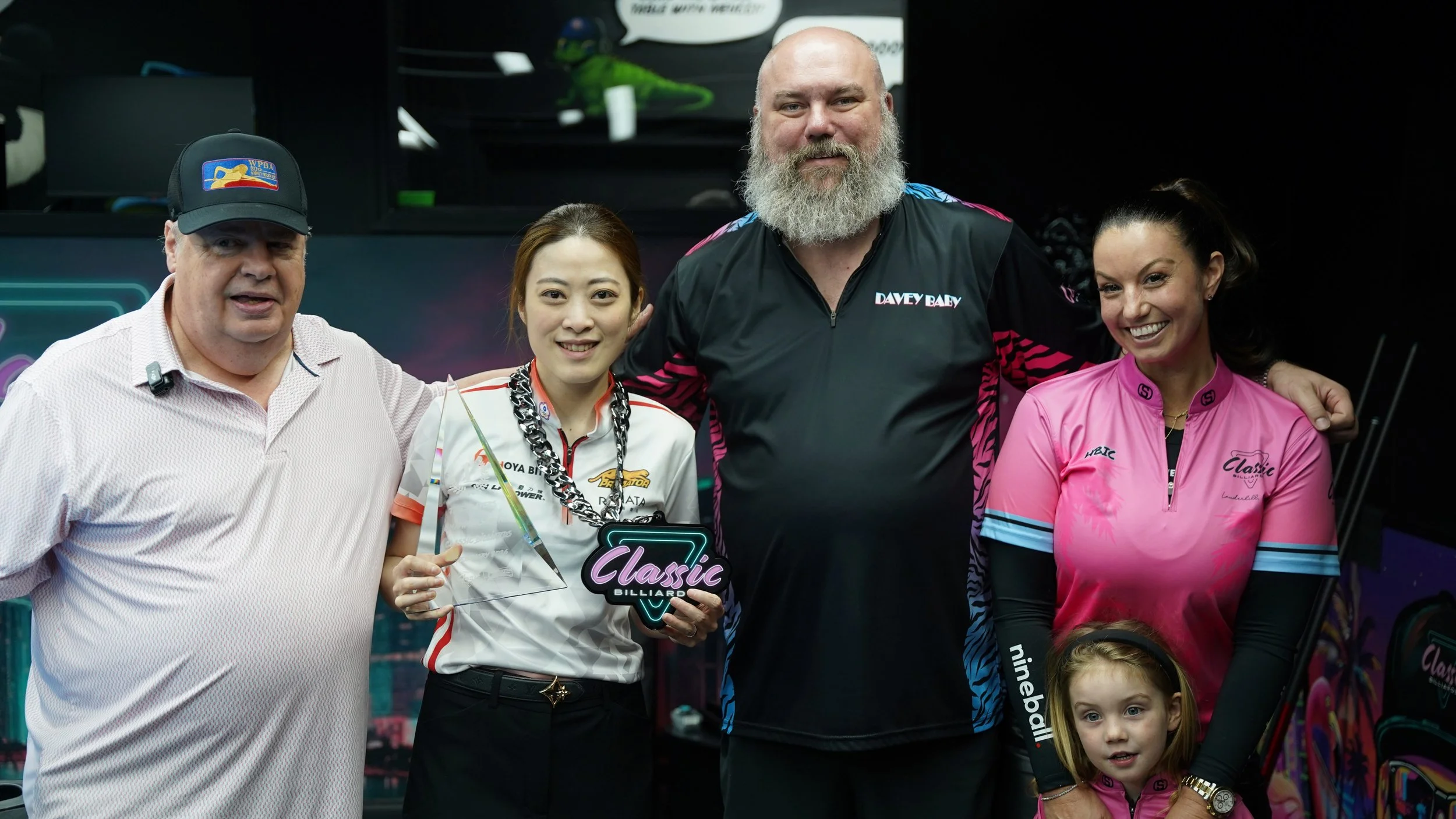 Left to Right: Dean Roessler (WPBA President) Chieh-Yu Chou “Rita” (Tournament Champion) Dave, Leah & Domicela Bartosiak (Owners of Classic Billiards)